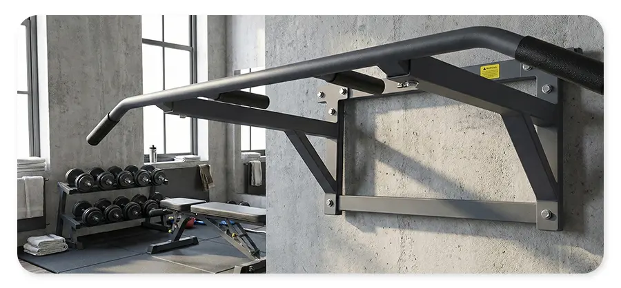 Drążek jest wyposażony we wsporniki, które dodatkowo wzmacniają konstrukcję i zwiększają bezpieczeństwo ćwiczeń. 4 antypoślizgowe uchwyty rozmieszczono w odstępach: 115 cm i 27 cm. Zewnętrzna para drążków, zakończona zakrzywionymi uchwytami, pozwala ćwiczyć w komfortowej pozycji leżącej, wzmacniając tym samym większe ilości mięśni.