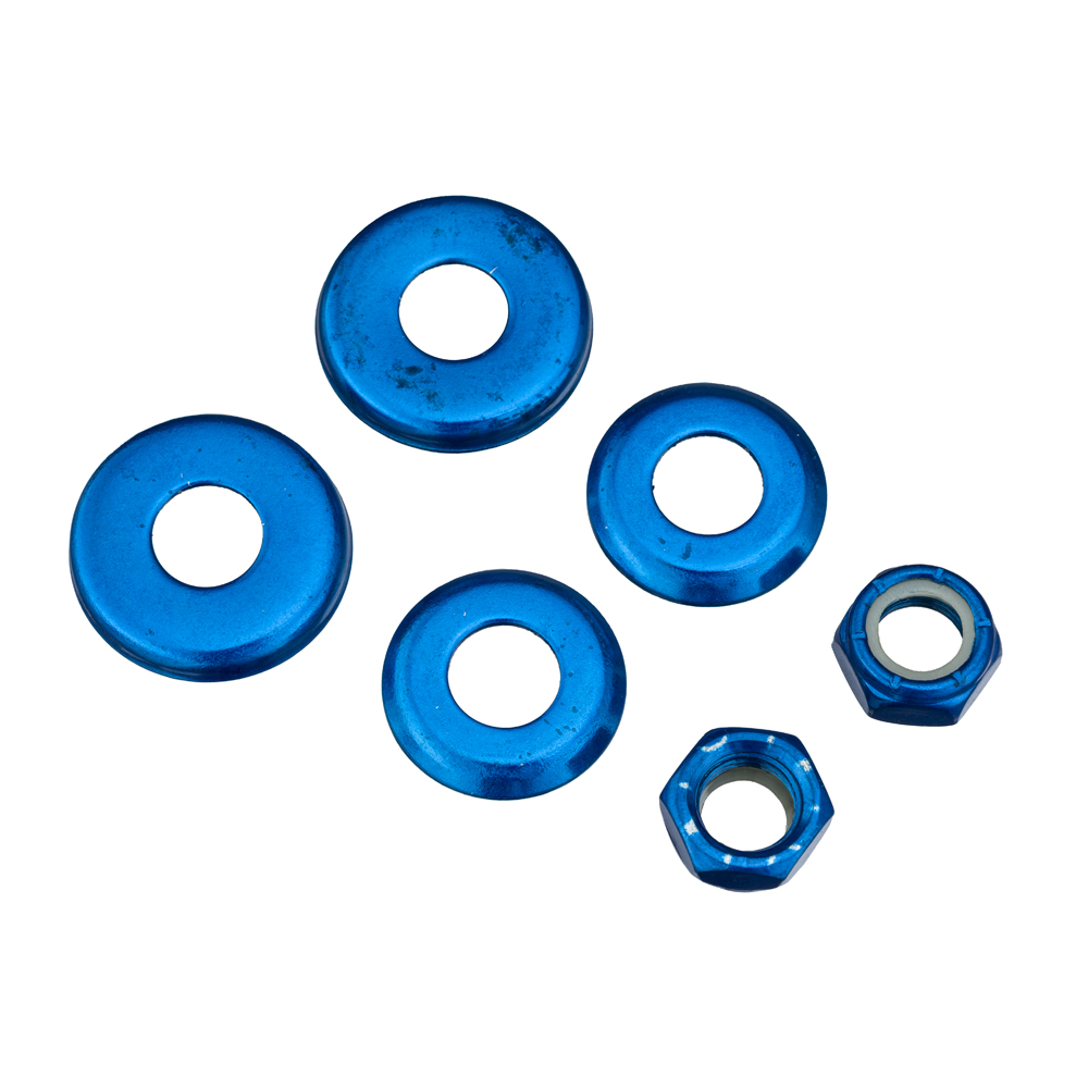 Podkładki do tulei to okrągłe, metalowe podkładki, które umieszcza się pod tulejami w truckach deskorolek. Celem stosowania podkładek jest zabezpieczenie tulei w truckach oraz zapobieganie deformacji silentbloku, do której może dojść w wyniku nacisku wywieranego na trucki podczas jazdy. Ponadto, podkładki zwiększają prędkość obrotową i zmniejszają tarcie kół. Zestaw składa się z 2 górnych i 2 dolnych podkładek oraz pary nakrętek, dzięki czemu sprawdzi się zarówno do przednich, jak i tylnych trucków.