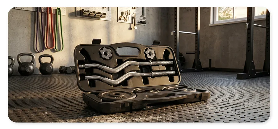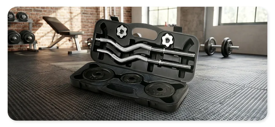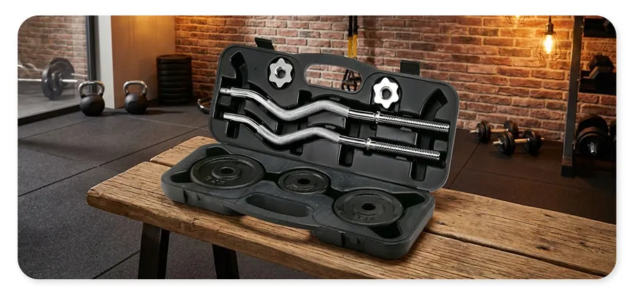 Stalowy zestaw z gryfem, obciążeniami i zaciskami zabezpieczającymi, umieszczony w solidnej walizce, antypoślizgowa powierzchnia, trwałe materiały. więcej