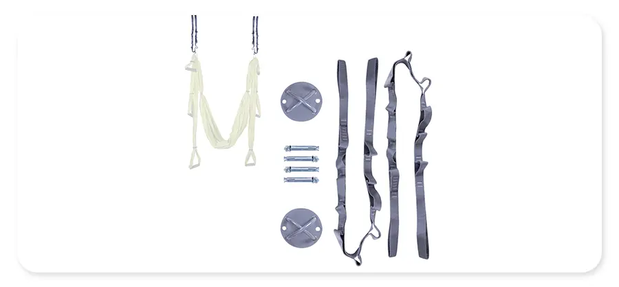 2 regulowane pasy, 2 wsporniki sufitowe, 4 śruby mocujące - przeznaczone do bezpiecznego mocowania hamaka do ćwiczeń jogi. więcej