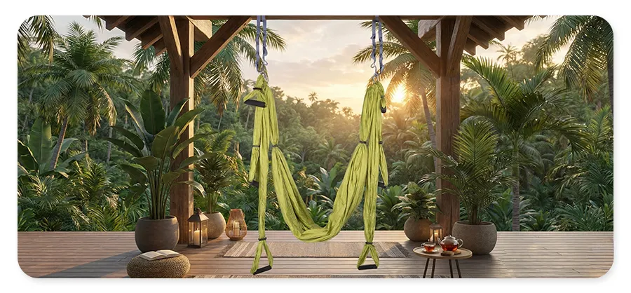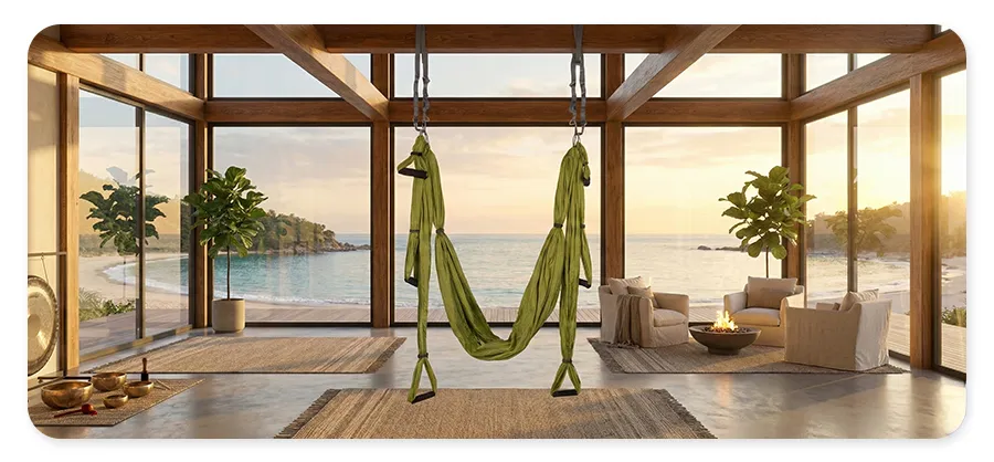 Hamak do ćwiczeń jogi w powietrzu. Sześć uchwytów, solidne karabińczyki, przyjemny w dotyku, komfortowy materiał. W zestawie: pasy, wsporniki sufitowe i śruby mocujące. więcej