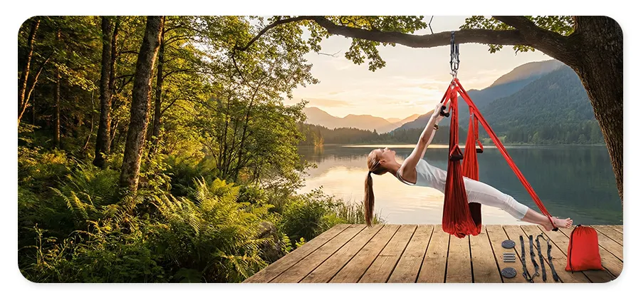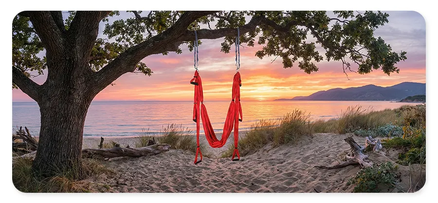 Hamak do ćwiczeń jogi w powietrzu. Sześć uchwytów, solidne karabińczyki, przyjemny w dotyku, komfortowy materiał. W zestawie: pasy, wsporniki sufitowe i śruby mocujące. więcej
