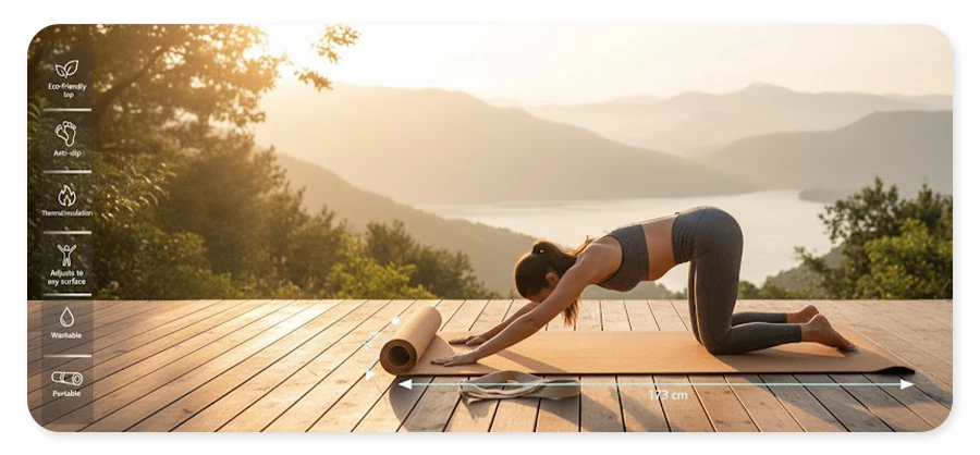 Wierzchnią część wykonano z naturalnego korka, który charakteryzuje się dużą odpornością na ścieranie. Dolna część składa się z antypoślizgowego materiału z moletowaniem, dzięki czemu mata stabilnie trzyma się podłoża.