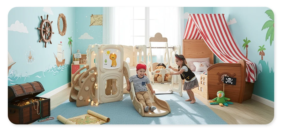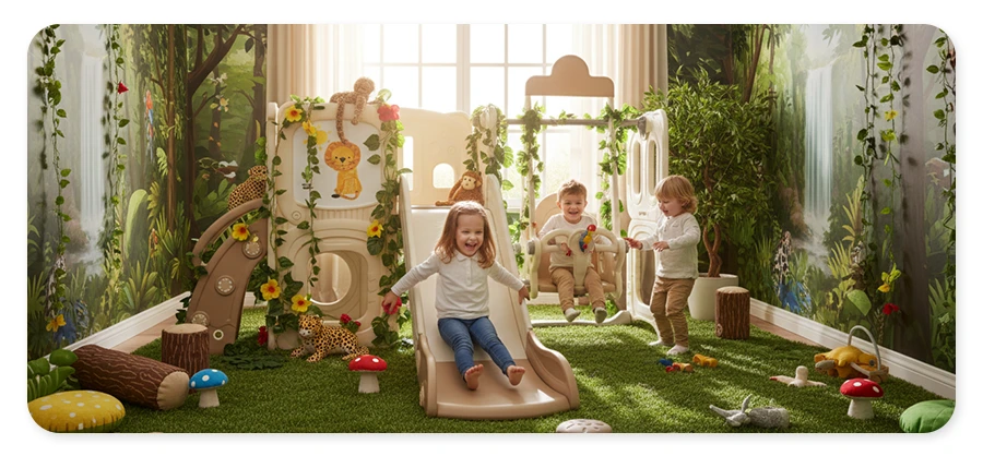 Wewnętrzny plac zabaw ze zjeżdżalnią został zaprojektowany z myślą o maksymalnym bezpieczeństwie dzieci. Nie znajdziesz tu żadnych ostrych krawędzi ani narożników. Dzięki antypoślizgowej powierzchni i ochronnym ścianom bocznym nie ma ryzyka upadku.