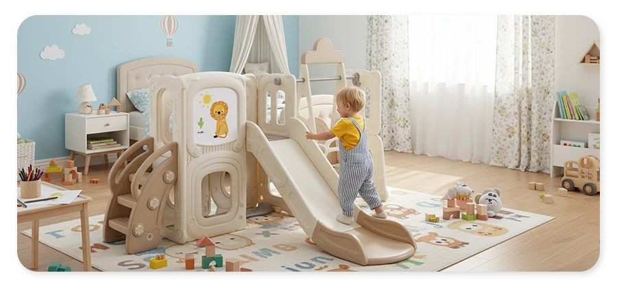 Odkryj formę, która inspiruje do zabawy i doskonale komponuje się z nowoczesnym wnętrzem. Domowy plac zabaw inSPORTline Nikino został zaprojektowany z myślą o estetycznej perfekcji, gdzie matowa tekstura materiału HDPE jest nie tylko przyjemna w dotyku, ale również odporna na ślady małych dłoni. To jakość premium i minimalistyczny design, które wprowadzają do pokoju dziecka spokój i elegancję, udowadniając, że przestrzeń do zabawy może być piękna.