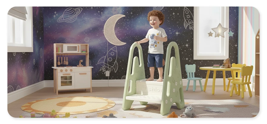 Pozwól swoim dzieciom doświadczyć radości z odkrywania i zapewnij sobie spokój ducha dzięki temu stołkowi, który łączy w sobie bezpieczeństwo, funkcjonalność i nowoczesny design.