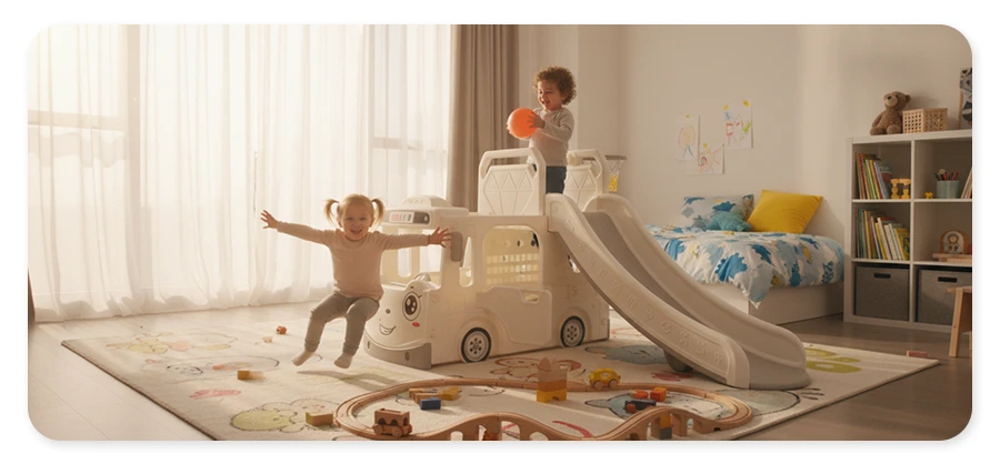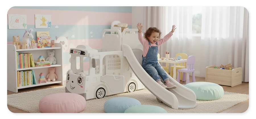 Połączenie zjeżdżalni o długości 160 cm i designerskiej podstawy w kształcie autobusu pomoże dziecku rozwinąć umiejętności fizyczne, koordynację i zdolności motoryczne. Obręcz do koszykówki ucieszy fanów sportu. Dzięki temu zestawowi dzieci mogą bawić się na różne sposoby w jednym miejscu.