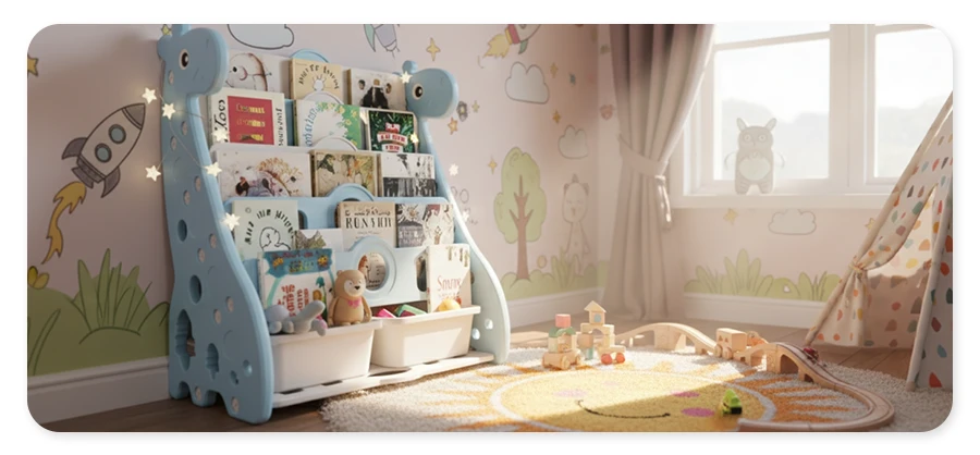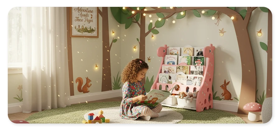 Uroczy regał z motywem żyrafy dla małych czytelników z możliwością regulacji dolnej półki, na której można umieścić zabawki. więcej
