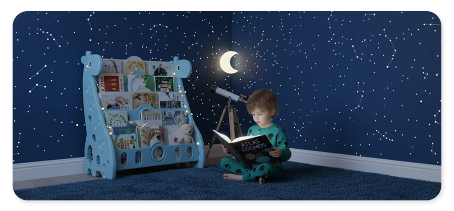 Potrzebujesz więcej miejsca na zabawki lub pomoce edukacyjne? Dolną półkę regału można z łatwością przekształcić w praktyczny schowek na najpotrzebniejsze rzeczy.