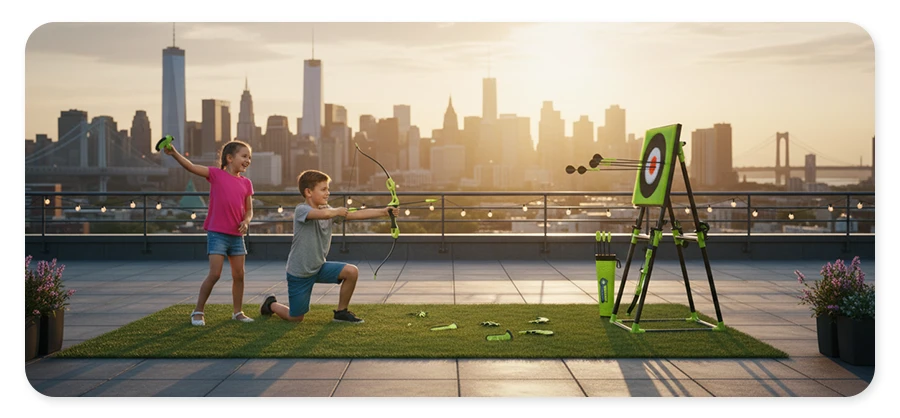 Twoje dziecko (dzieci) pozostanie bezpieczne nawet podczas treningu bojowego. Jak to możliwe? Końcówki strzał i broni do rzucania są pokryte gumą, która utknie w celu, który jest wykonany z gumowego włosia specjalnie zaprojektowanego do trzymania broni i strzał.
