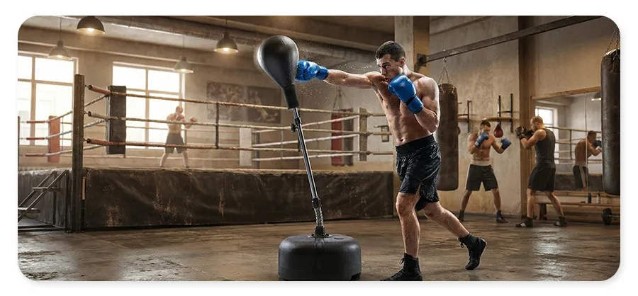 Boxerska gruszka z regulowaną wysokością i sprężyną do optymalnego treningu refleksu. Idealna dla początkujących i zaawansowanych użytkowników, z możliwością napełnienia piaskiem lub wodą.