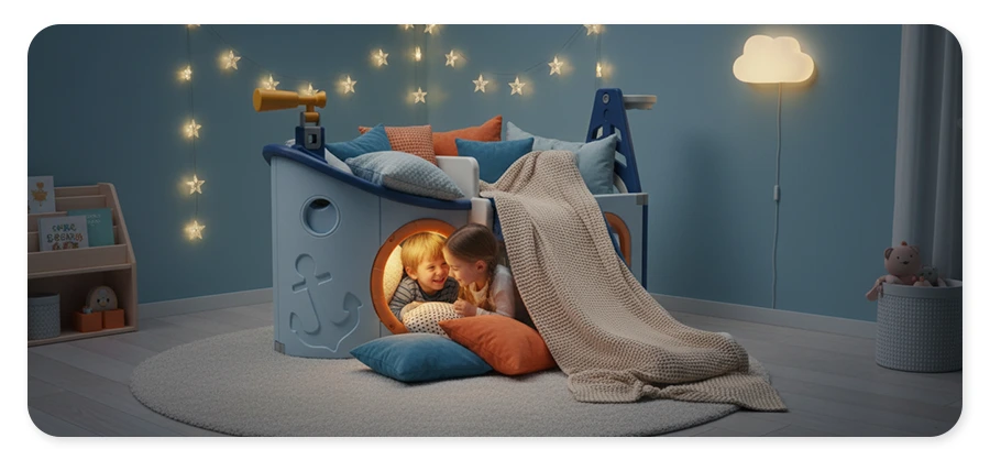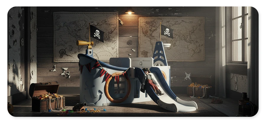 Bezpieczny wewnętrzny plac zabaw dla małych piratów. Zawiera interaktywne elementy o tematyce statku i zjeżdżalnię. Trwały, bezpieczny dla dziecka materiał. więcej