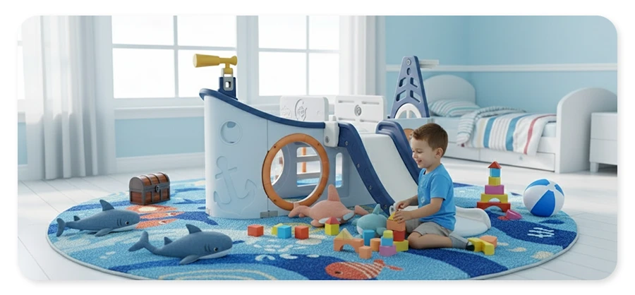 Ten wewnętrzny plac zabaw ze zjeżdżalnią został zaprojektowany tak, aby zapewnić dzieciom bezpieczeństwo przez cały czas. Dlatego nie ma ostrych krawędzi ani narożników. A dzięki antypoślizgowej powłoce powierzchni i poręczy ochronnej Twoje dziecko nie spadnie.