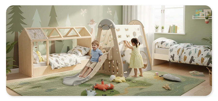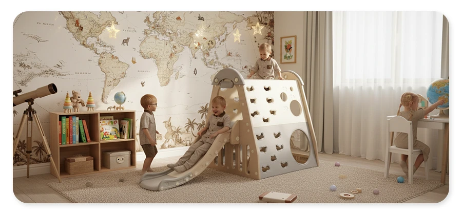 Bezpieczny wewnętrzny plac zabaw dla małych poszukiwaczy przygód ze ścianką wspinaczkową, zestawem huśtawek, zjeżdżalnią, obręczą do koszykówki i kółkami gimnastycznymi. Trwały, nietoksyczny materiał, interaktywne elementy i zabezpieczenia. więcej