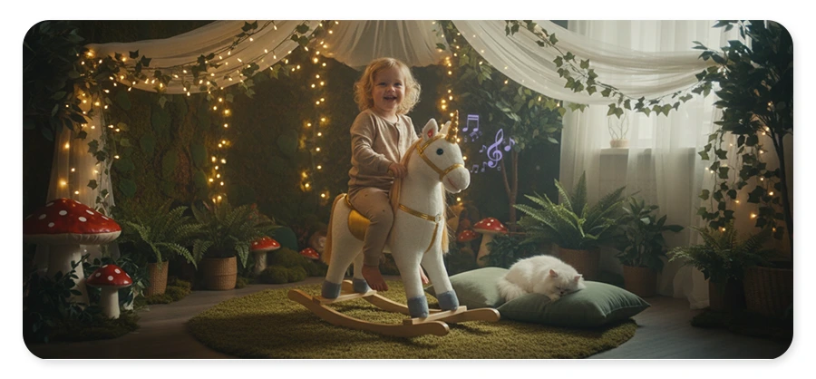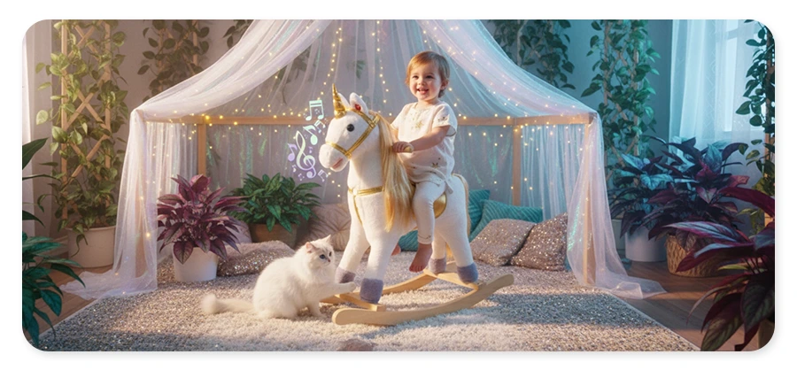 Jednorożec jest łatwy w montażu, więc dziecko będzie mogło się nim bawić w mgnieniu oka. Oprócz bujania, jednorożec oferuje również inne funkcje, które sprawiają, że zabawa jest jeszcze przyjemniejsza. Każde z jego uszu oferuje swój własny efekt - możesz spodziewać się dźwięku galopu i rżenia, a także poruszania pyskiem. Ta zabawka jest prawie jak prawdziwy koń!
