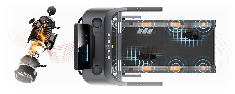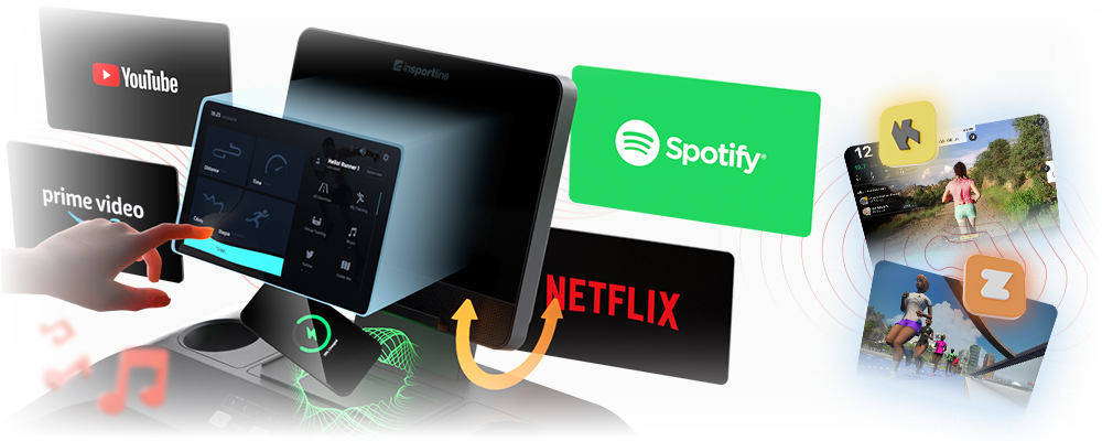 Na pierwszy rzut oka będziesz pod wrażeniem 15,6-calowego ekranu dotykowego TFT, który nie tylko zapewnia przejrzysty przegląd wszystkich danych treningowych, ale także zapewnia rozrywkę podczas treningu. Wstępnie zainstalowane aplikacje, takie jak YouTube, Netflix, Spotify, Facebook, Chrome i Prime Video sprawiają, że każda minuta na bieżni jest przyjemna. Oczywiście dostępna jest łączność Bluetooth dla słuchawek, ładowanie bezprzewodowe i USB telefonu oraz elementy sterujące Touch & Run na uchwytach do szybkiej regulacji nachylenia i prędkości.