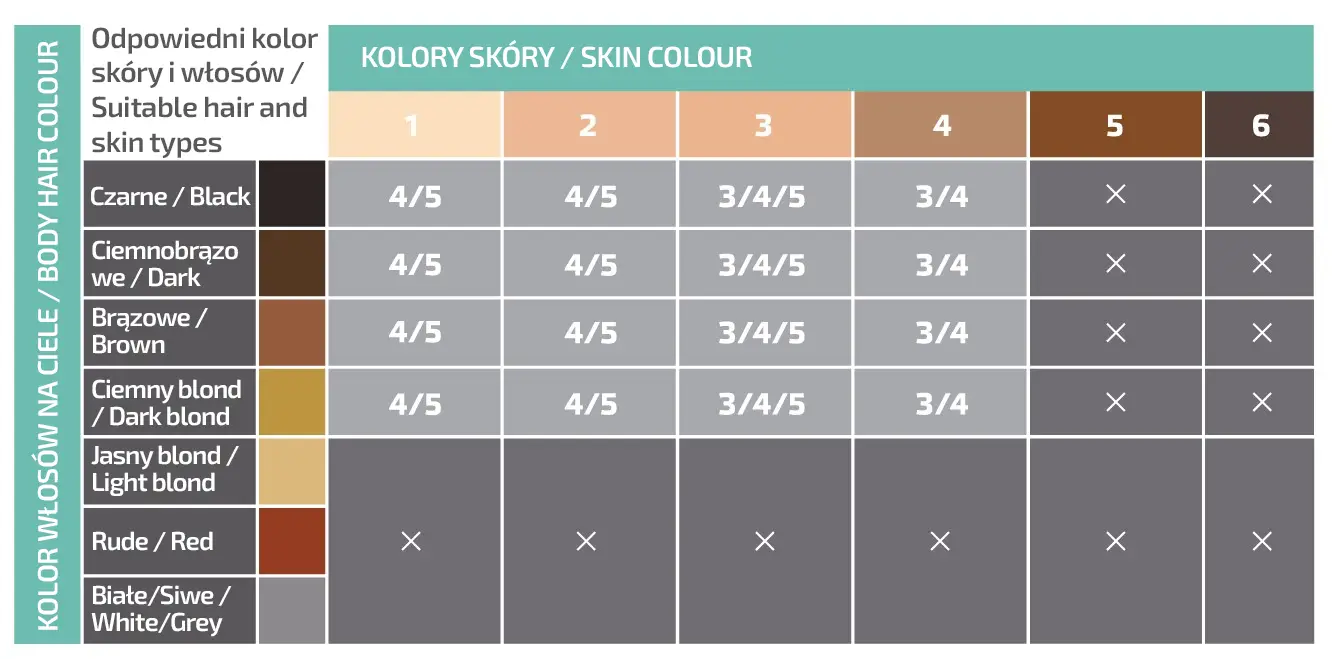 Epilator nie jest odpowiedni do bardzo ciemnego pigmentu skóry lub jasnych włosów (od białych/szarych do blond). Depilacja IPL nie powinna być stosowana na obszarach skóry, na których znajdują się tatuaże - może powodować podrażnienia i oparzenia ze względu na wysoką zawartość pigmentu.